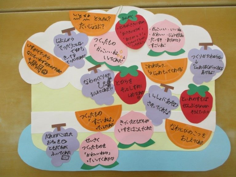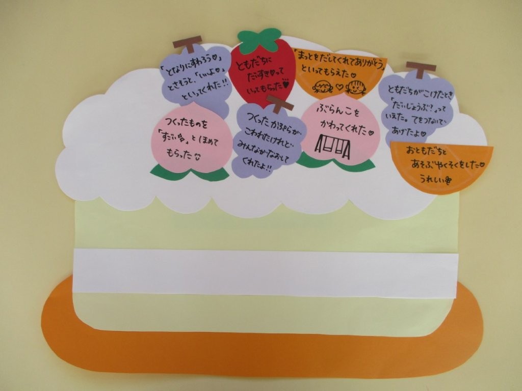 全クラスで、ふわふわことば集め(ことば・行動)をし、ケーキにトッピングしました。