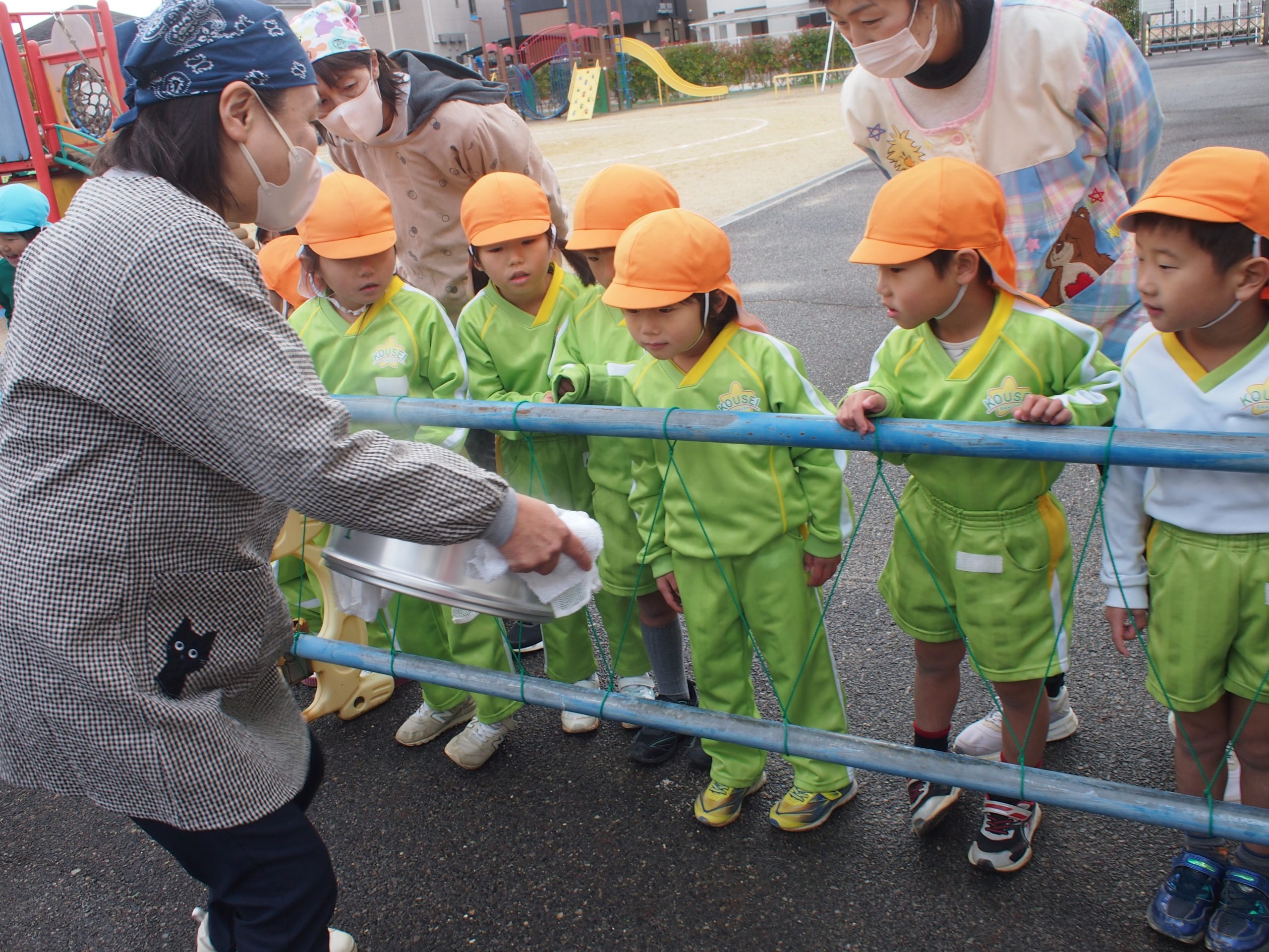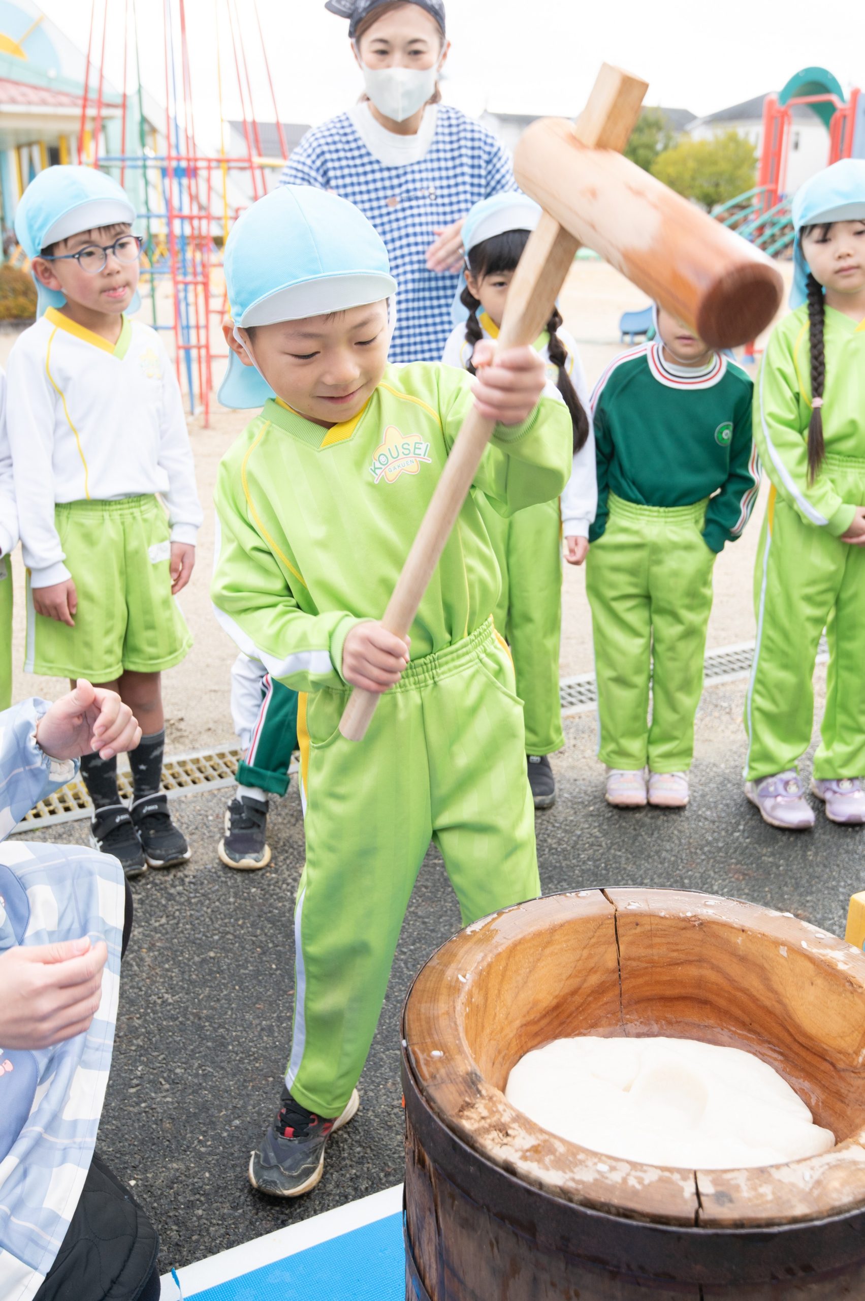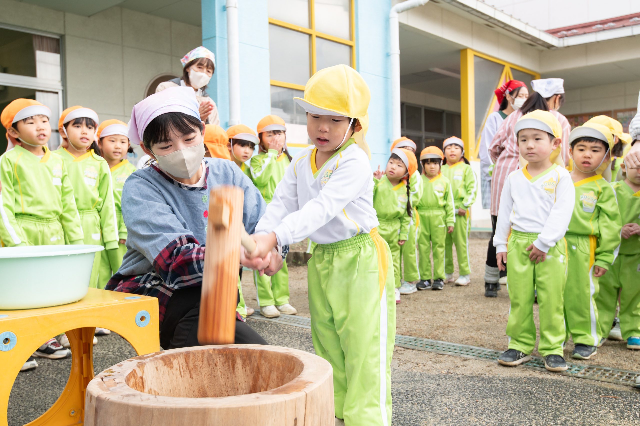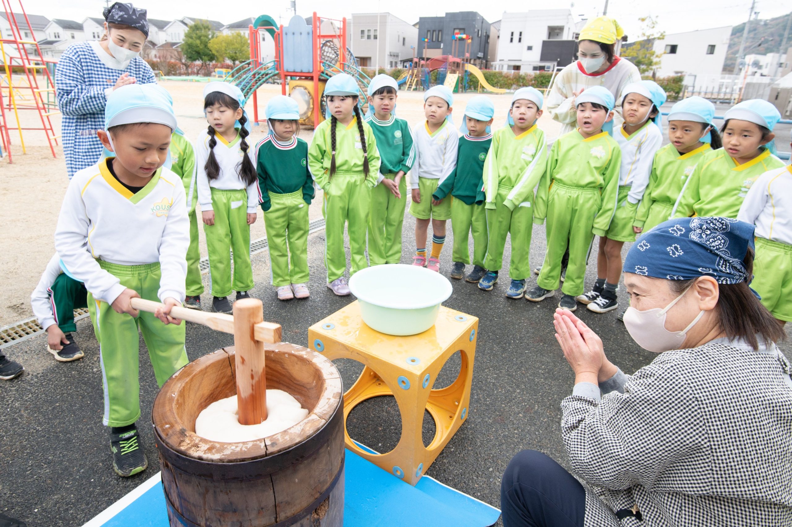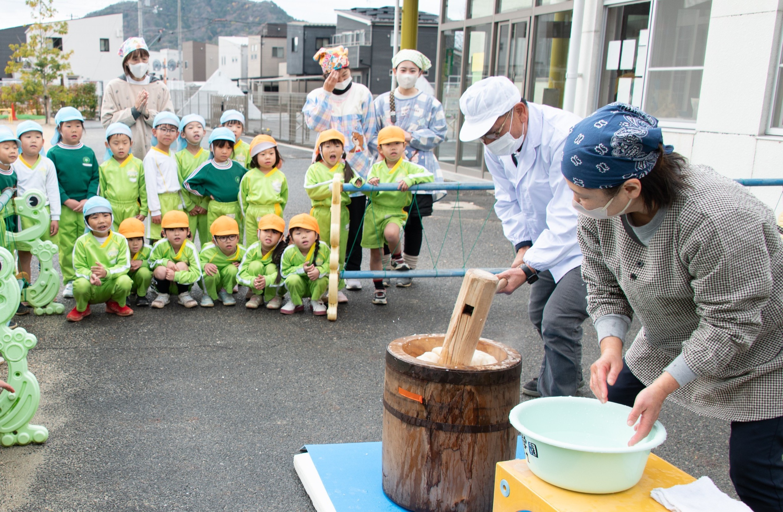 園長先生とバスの先生のおもちつきを見てから、子どもたちも挑戦しました★
