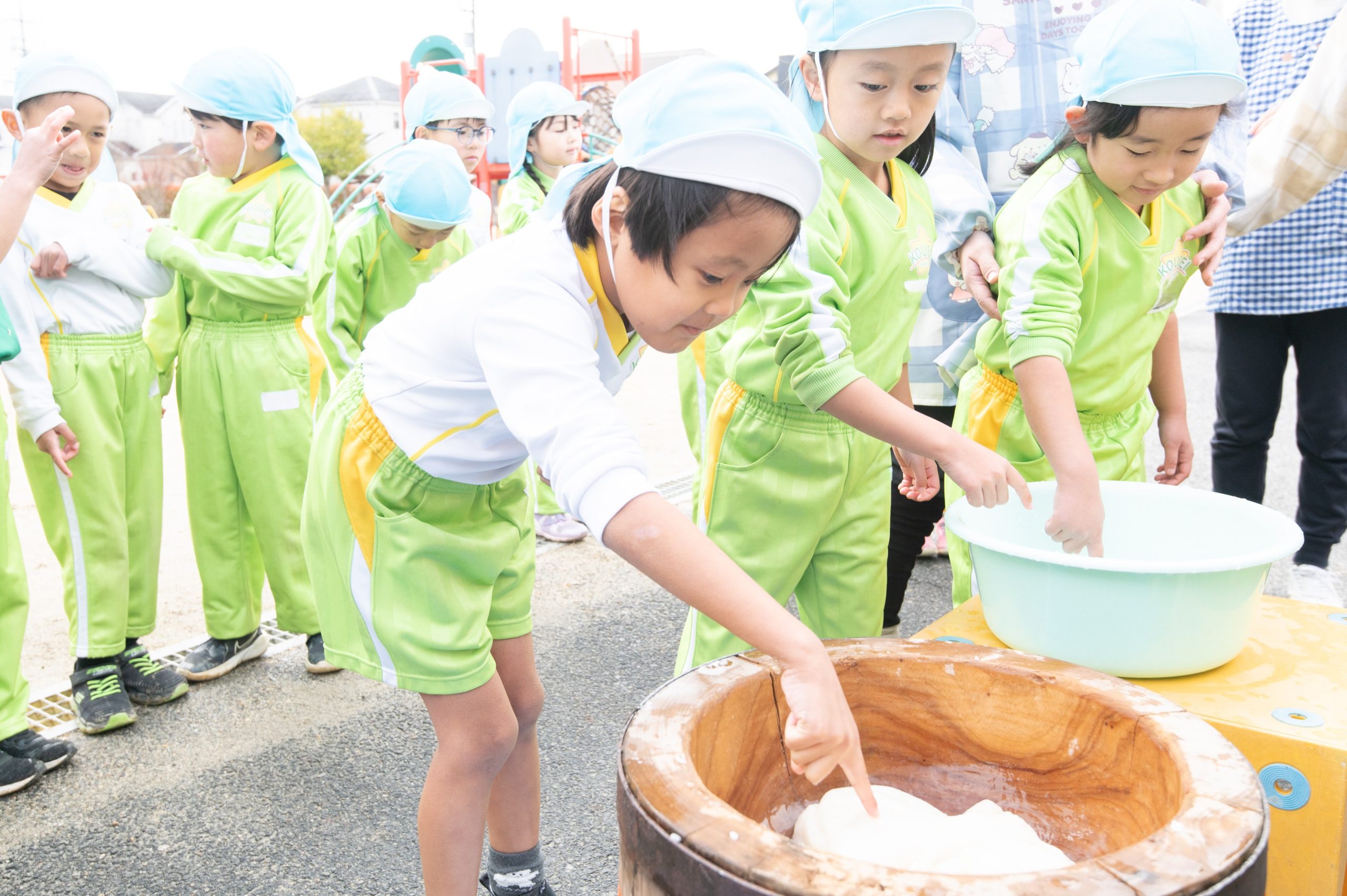 前日に「おもちつき」の絵本を見て、「おもちつき楽しみ♪」「早くしたいな!」と期待を膨らませていた子どもたち。