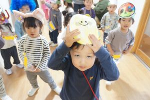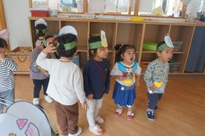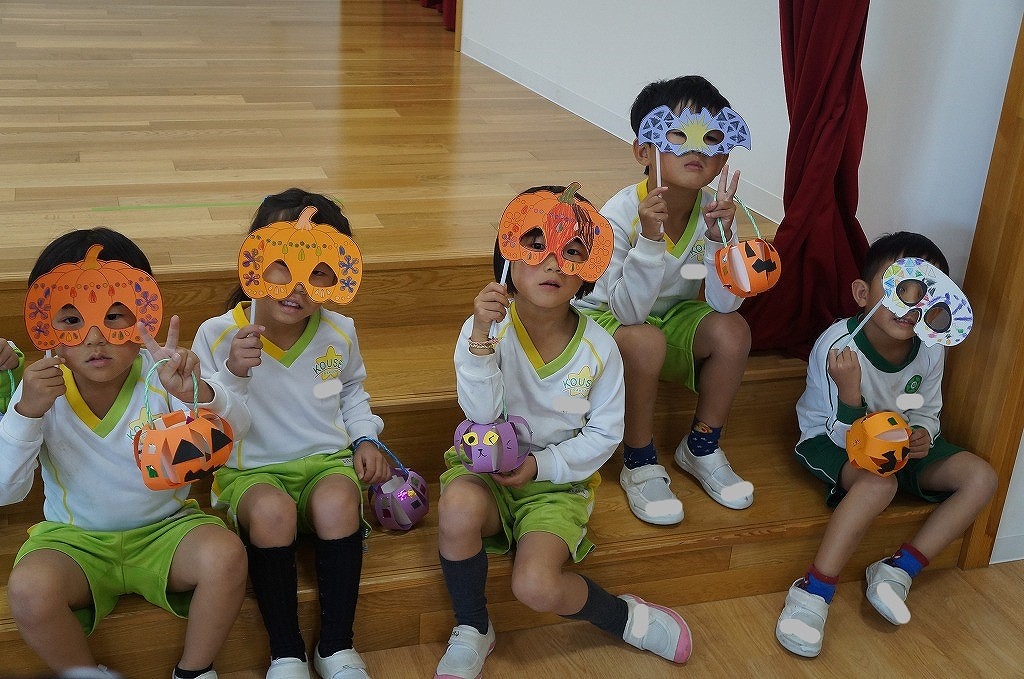 うさぎ組でもハロウィンパーティーをしており、「トリックオアトリート」の合言葉を言いながら園内を散歩しました。