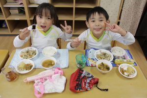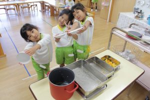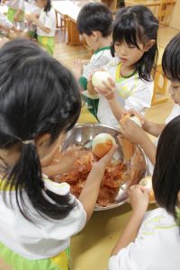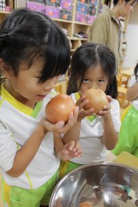 5歳児は食育の一環として玉ねぎの皮むきをしました。