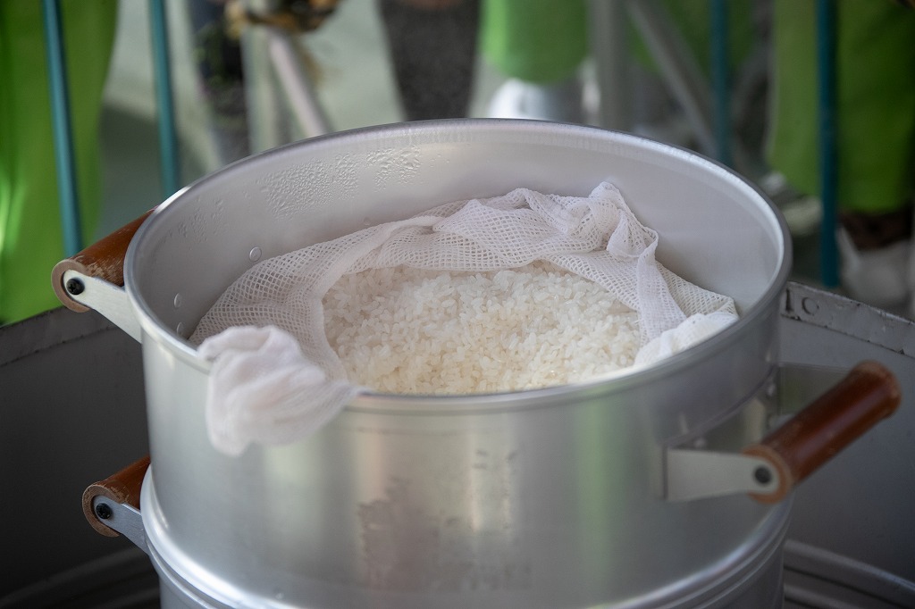 朝からもち米を蒸す様子を見て大興奮!蓋を開けるともくもくと湯気が出ていい匂いが♡