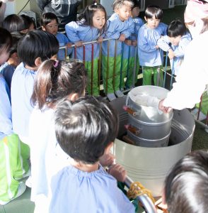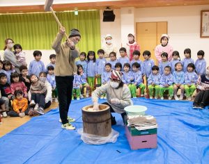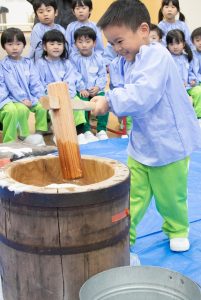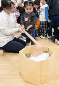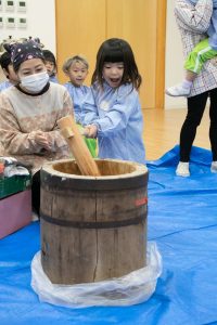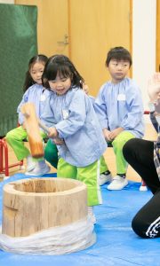 もち米を蒸す様子を見た後は、遊戯室に行き、園長先生とバスの先生が餅をつく様子を見て大興奮な子どもたち!「よいしょ!」と声を出しながらみんなで餅つきを楽しみました♪