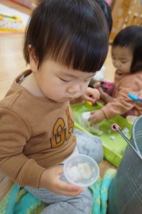 0・1歳児クラスも初めて触る雪に不思議そうにしながらも、カップに入れて遊んだり、ふわふわの雪を触ったり、雪の冷たさを味わいました♪
